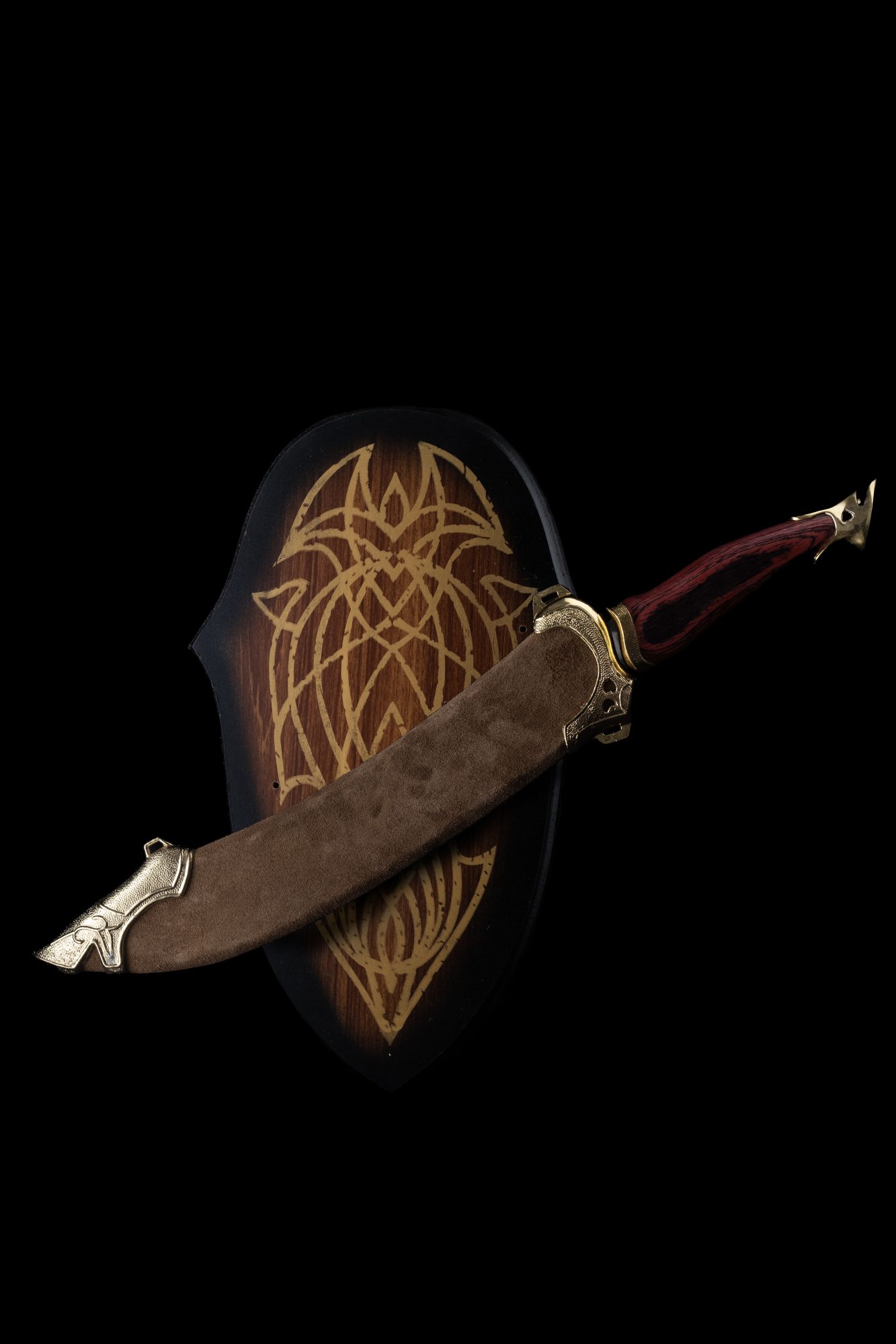 Inspired by the dagger gifted to Aragorn by Lord Celeborn in The Lord of the Rings: The Fellowship of the Ring, this stainless steel replica reflects the grace and craftsmanship of the Elves of Lothlórien. Complete with a suede scabbard, brass fittings, and a wooden wall plaque, it’s a refined and meaningful addition to any Middle-earth collection.