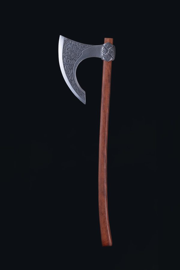 This axe first appeared as. early as the 6th century but was not prevalent in this style until roughly the 8th century, which the beard of the axe was curved enough to allow for disarming opponents with on move while still being able to serve heavy slashes. This axe is engraved with Viking symbology and engravings popular in fighting weapons.
