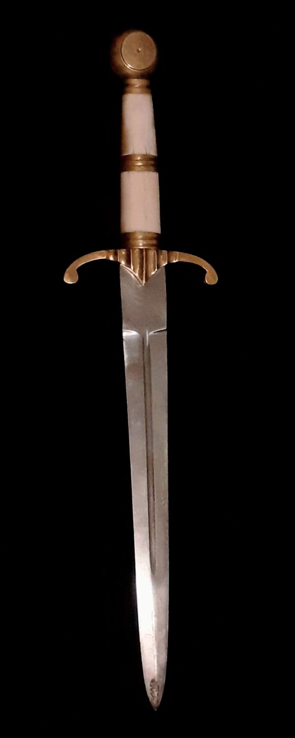 The dagger pictured is a smaller steel replica of this blade (roughly 44cm long) and comes with brass fittings and a camel bone handle. Th8is dagger also comes with a leather scabbard.