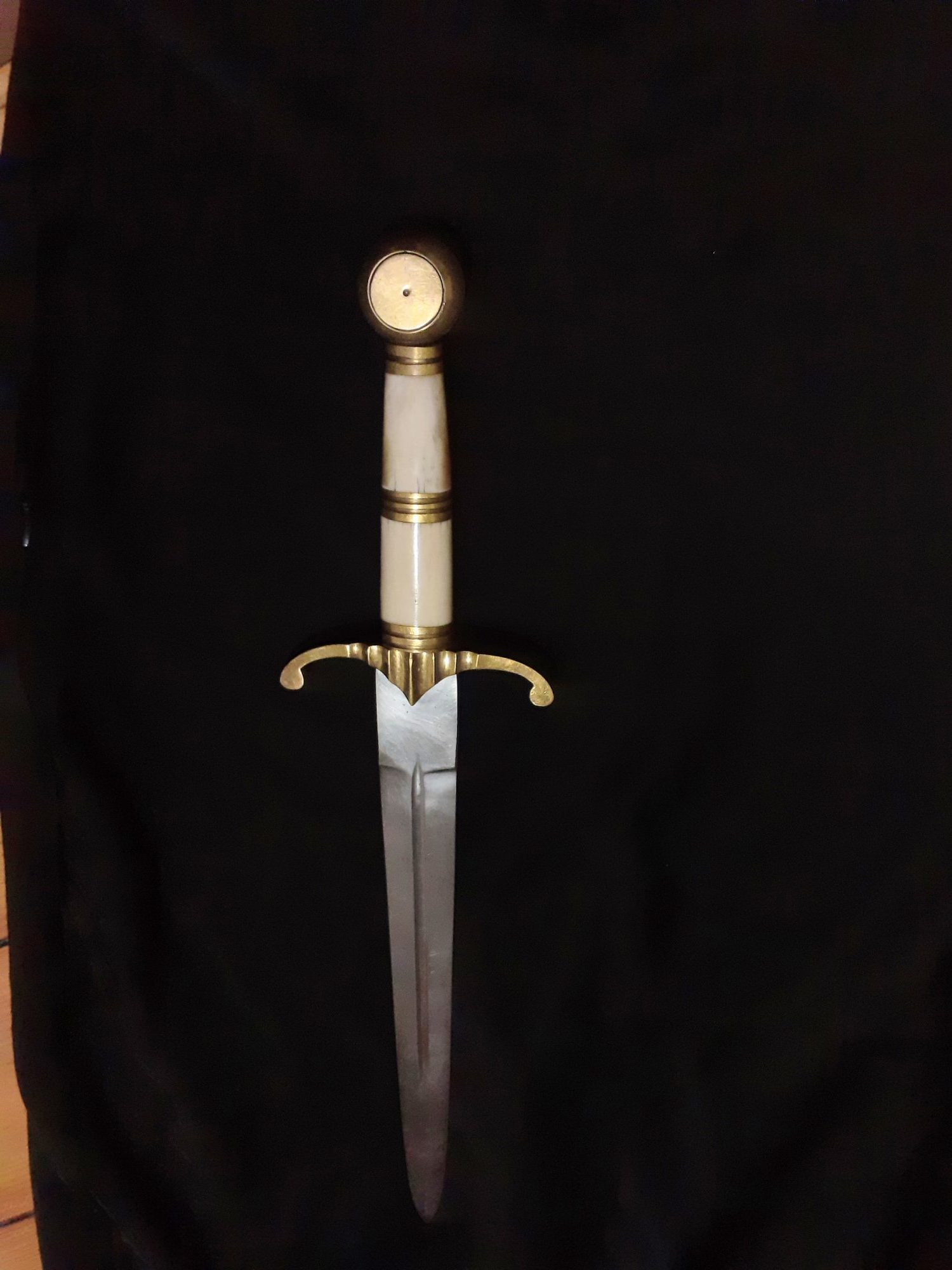 The dagger pictured is a smaller steel replica of this blade (roughly 44cm long) and comes with brass fittings and a camel bone handle. Th8is dagger also comes with a leather scabbard.