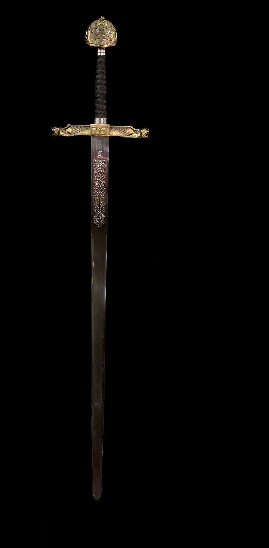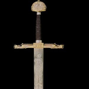 This sword is a replica of ‘Joyeuse’, the sword of consecration used for Charlemagne. Born in the year 742, he was emperor over the Holy Roman Empire, laying the foundations of what would become modern day Western Europe. This sword was described as: ‘Charlemagne was wearing his fine white coat of mail and his helmet with gold-studded stones; by his side hung Joyeuse, and never was there a sword to match it; its colour changed thirty times a day’. Beneath Charlemagne came his Paladins, warriors of such renown that they were the pentacle of valor and spirit in the early Middle Ages.