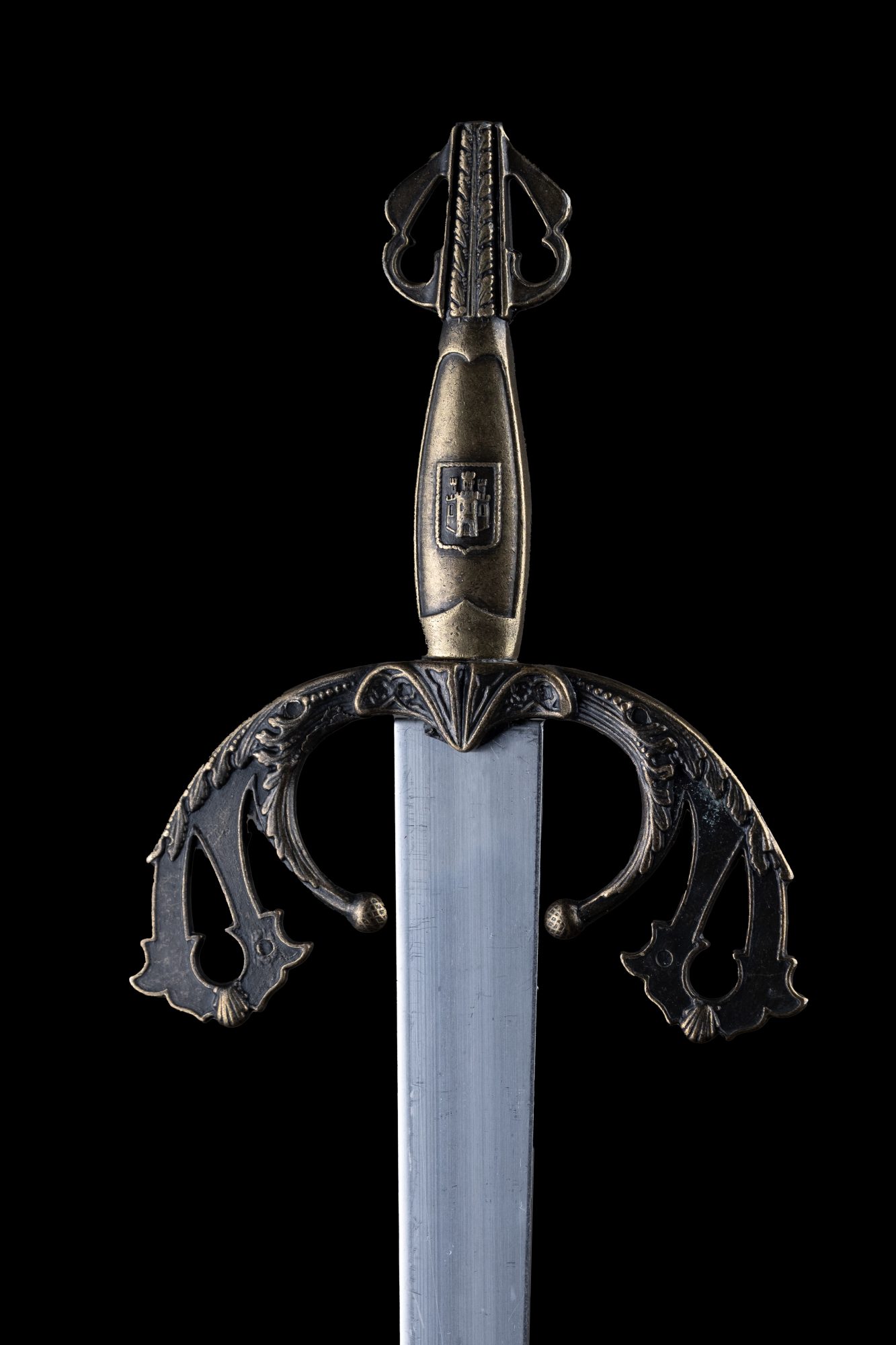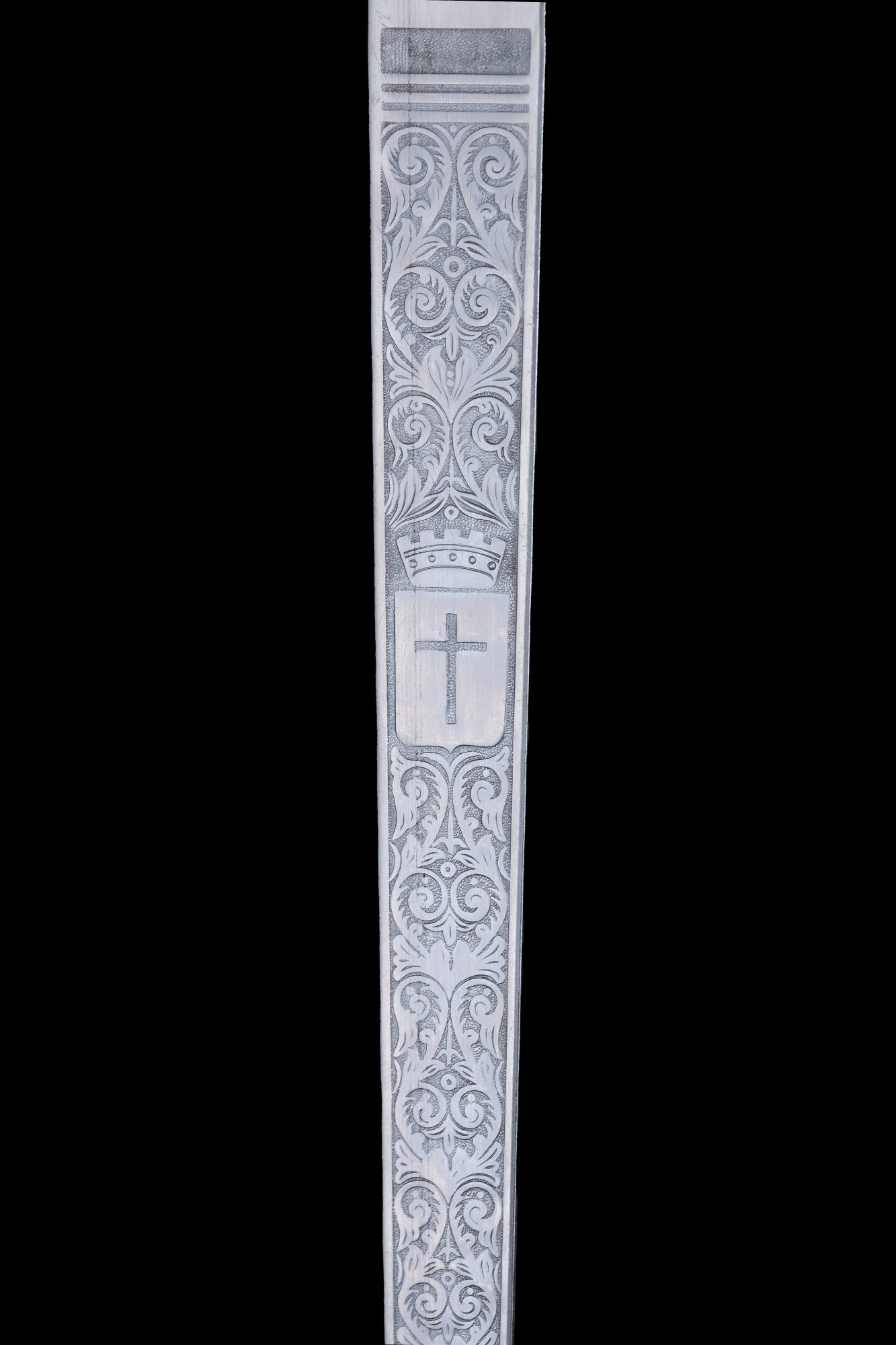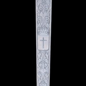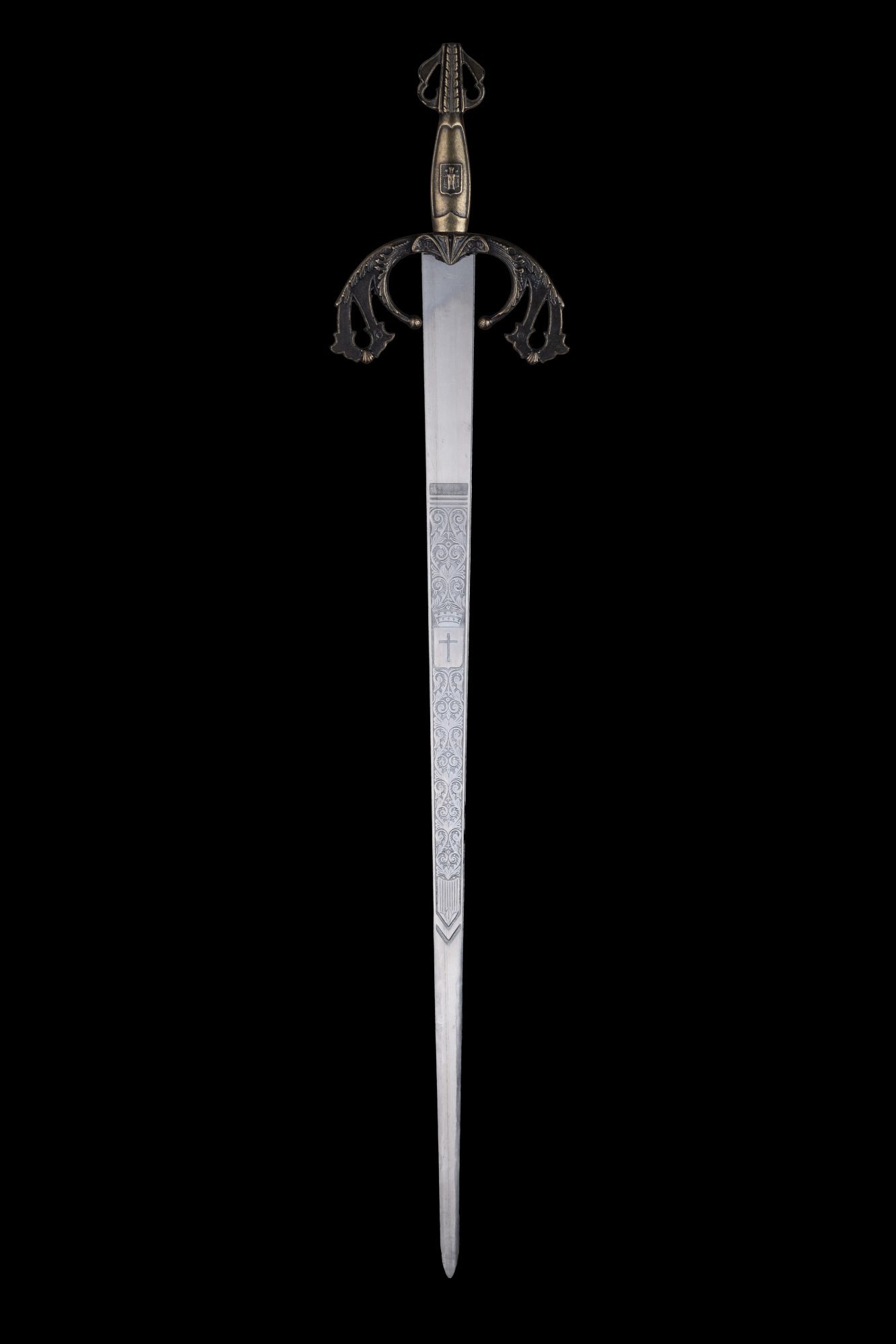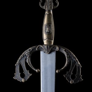 This sword is styled after the Spanish ceremonial broadsword and characterized by its long, branching hilt arms that curl in a pattern akin to a floral corolla. This is a style that was favored by the upper echelon of medieval Spanish society, but don’t be fooled by its softly curving hilt, for often the prettiest things hide the most dangerous edges.
