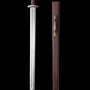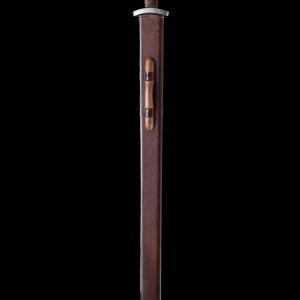 It features a forged and fullered steel blade designed for hacking and slashing and is hilted with a short guard and 5 lobed pommel. The wooden scabbard is wrapped with brown leather to match that of the leather wrapped sword grip. Although this sword has a forged blade it is not tempered and is not suitable for combat.