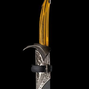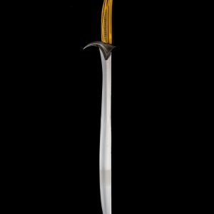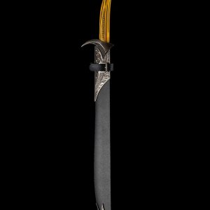 Orcrist, also known as “Goblin Cleaver” and “biter” by goblins, is a legendary blade originally foraged in the ancient Elvish kingdom of Gondolin, alongside its mate Glamdring, both of which glow blue when Orcs are near. Used to kill thousands of goblins in the First Age, it was eventually lost to time before being rediscovered in the cave of the mountain trolls by Thorin Oakenshield and the rest of his company. Thorin took up the blade as his own and carried it until it was confiscated by Mirkwood Wood-elves; however, it was returned to him upon his death and burial under the Lonely Mountain and was said to have “gleamed ever in the dark if foes approached.”