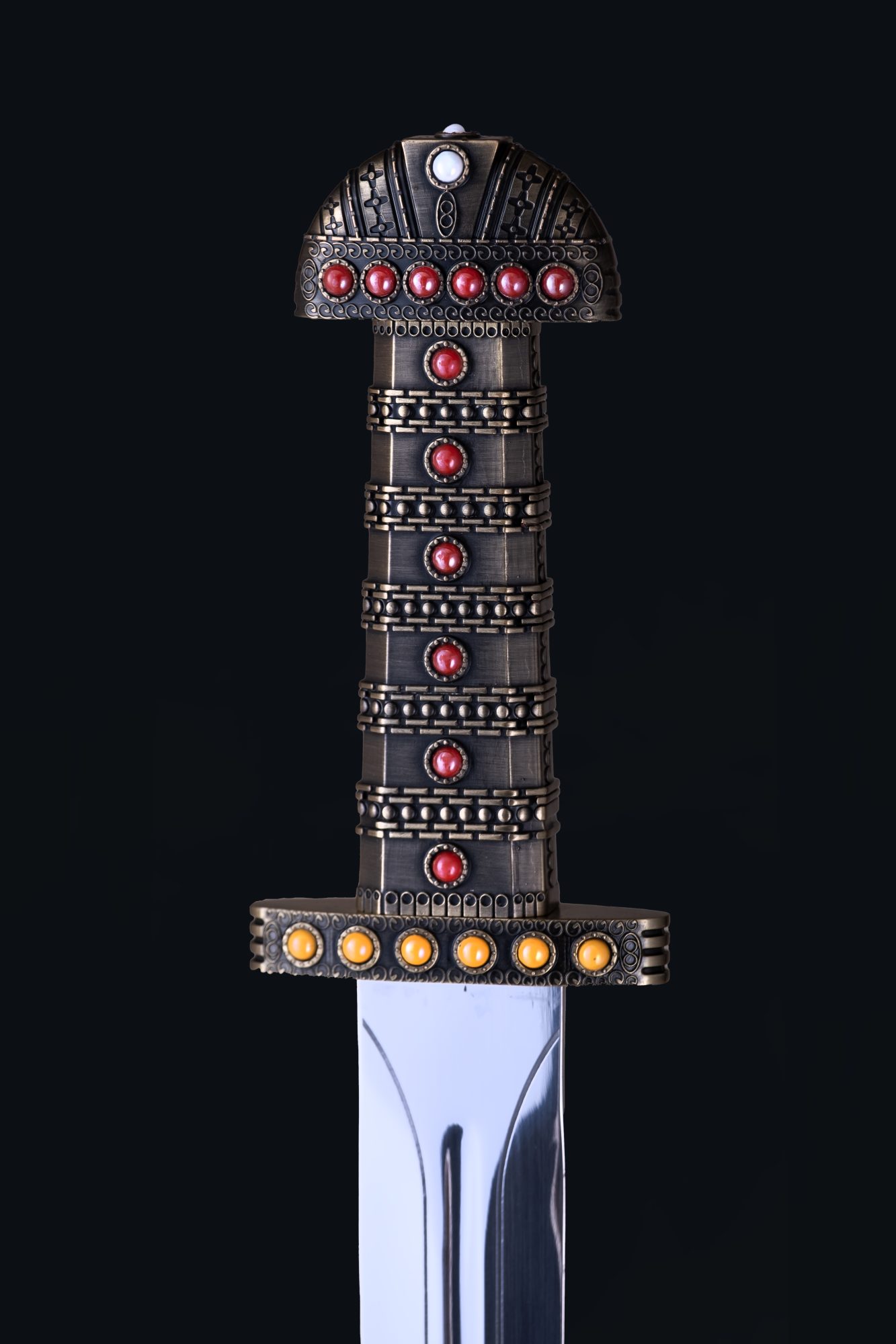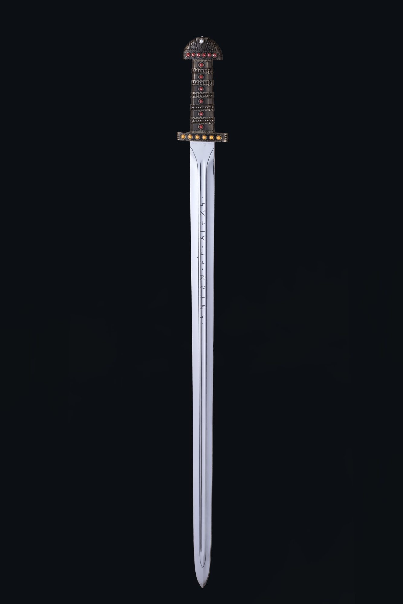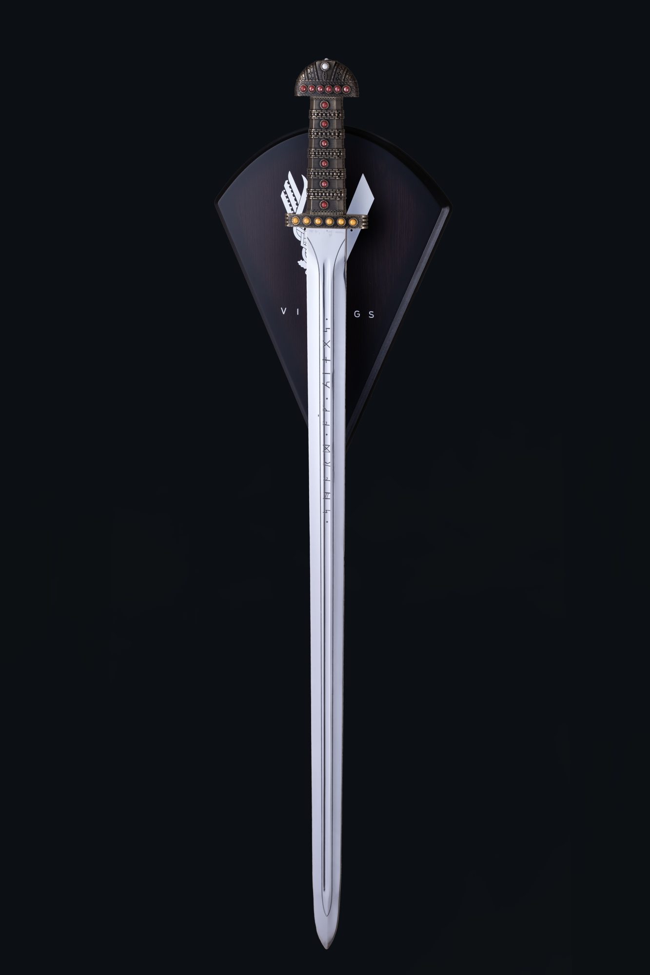 This sword is inspired by the popular TV show Vikings, and is the weapon used by the character Ragnar Lothbrok. The sword features a gilded gold handle with inset gems and traditional lacework. The blunted blade is deeply engraved with Viking runes.