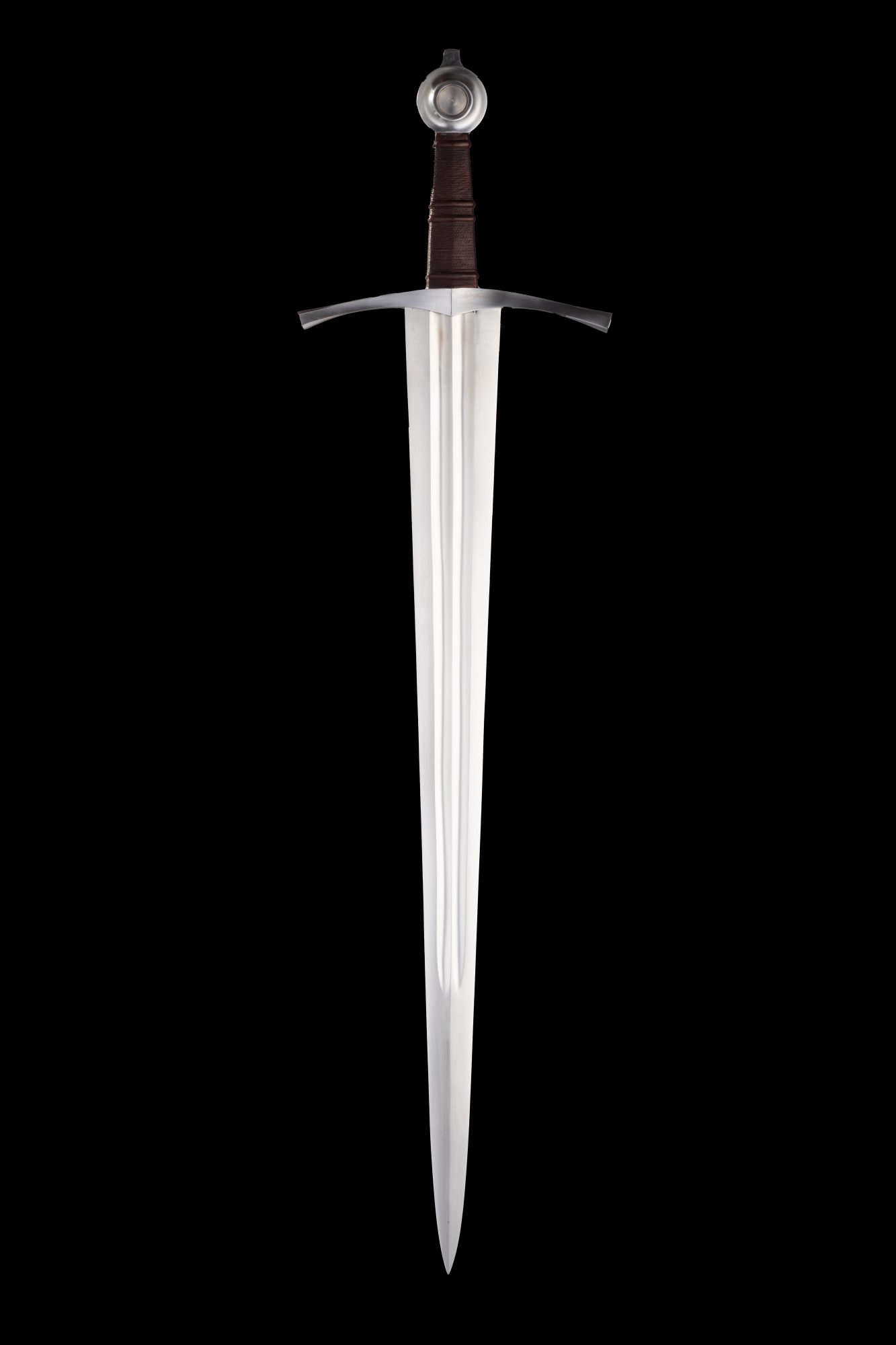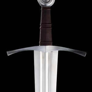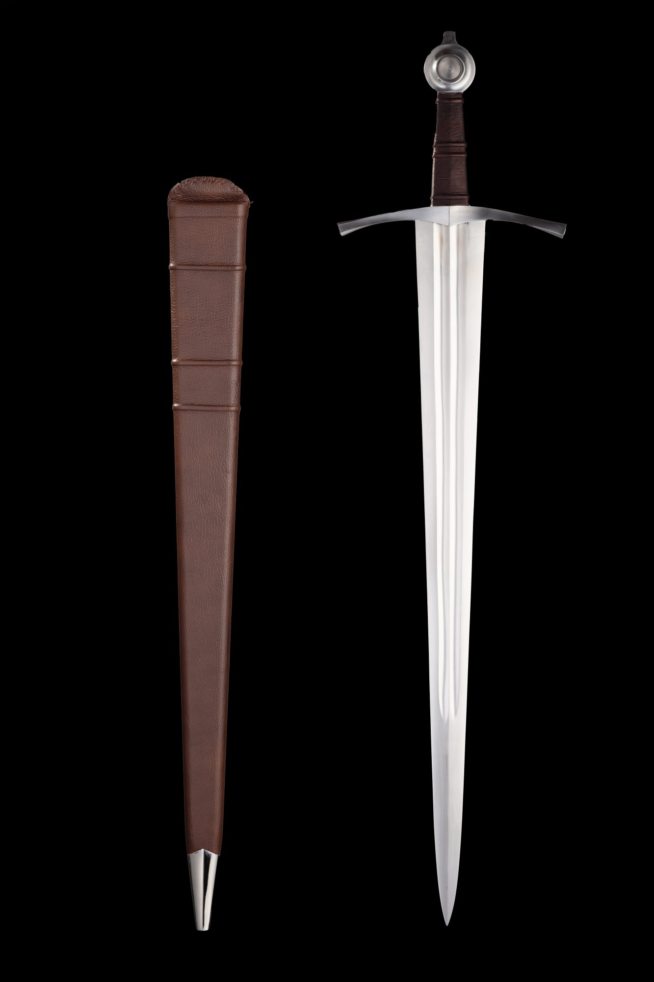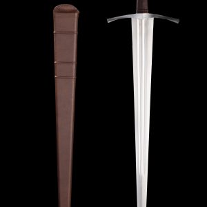 The Oakeshott typology was a system of sword classification created by Ewart Oakeshott to help classify different types of medieval sword into different groups and/or types (Types X-XXII). This classification helped trace the functionality and design of medieval swords across five centuries of use. This sword is based off his Type XIV, which were shorter, lighter blades that relied primarily on cutting in order to combat plate mail during the 14th century.